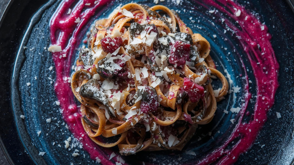 Cook tagliatelle, then toss with butterfly pea flower tea for a naturally deep blue hue. Add creamy Alfredo sauce and swirl with beetroot puree for nebula vibes.