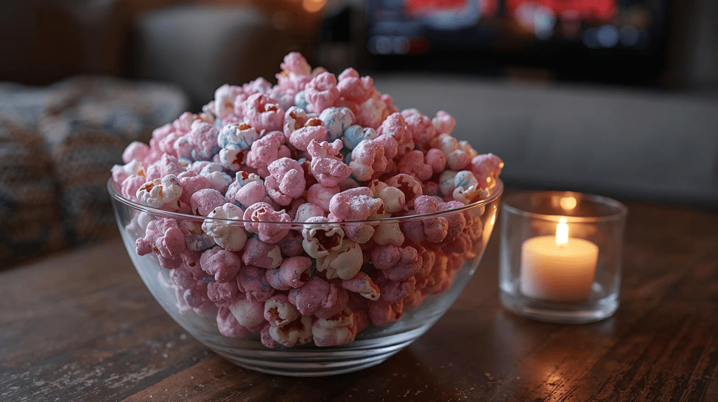 Popcorn coated with melted marshmallows, then toss with swirls of blue, purple, and pink food coloring.
