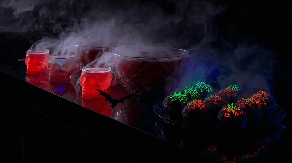 Keep drinks and snacks mysterious. Serve âBlood Red Sangria,â âWitchâs Brew Punch,â and black cupcakes with glowing toppers.â Decorate the bar with glowing skull cups and dry ice fog.