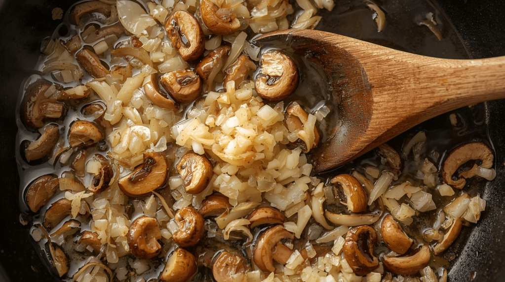 - Add mushrooms and cook until soft.