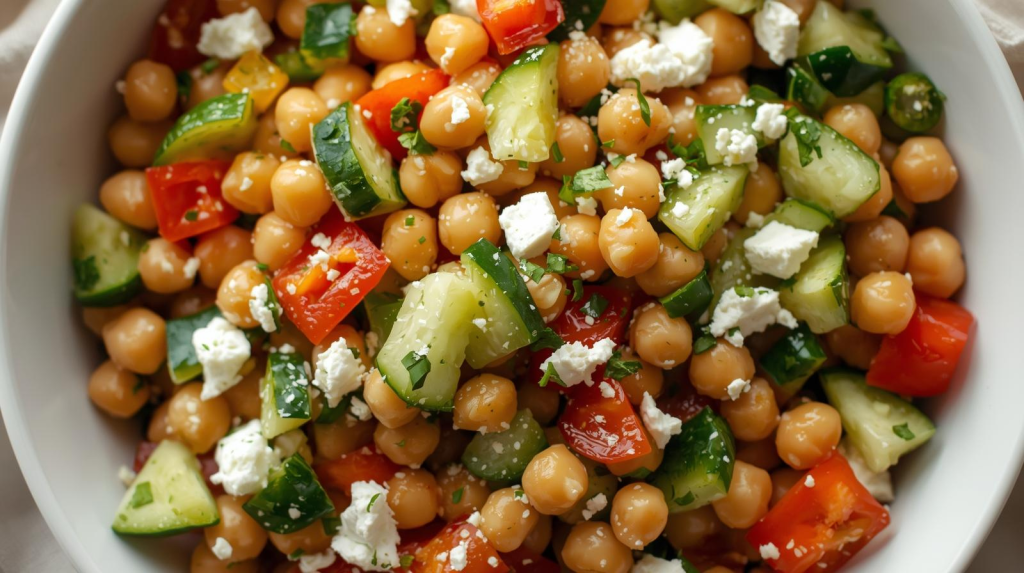 - Rinse chickpeas. Toss with cucumber, bell pepper, onion.