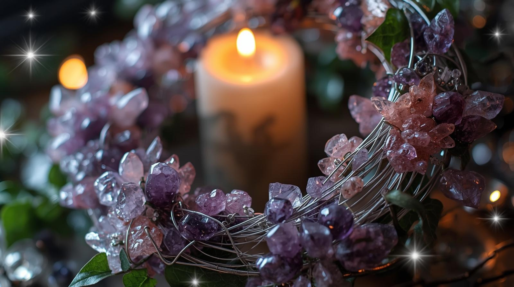 Wrap each crystal securely with thin wire, then attach them to different sections of the wreath. Space them evenly or cluster them in intentional “energy zones.” - Layer in Greenery:
