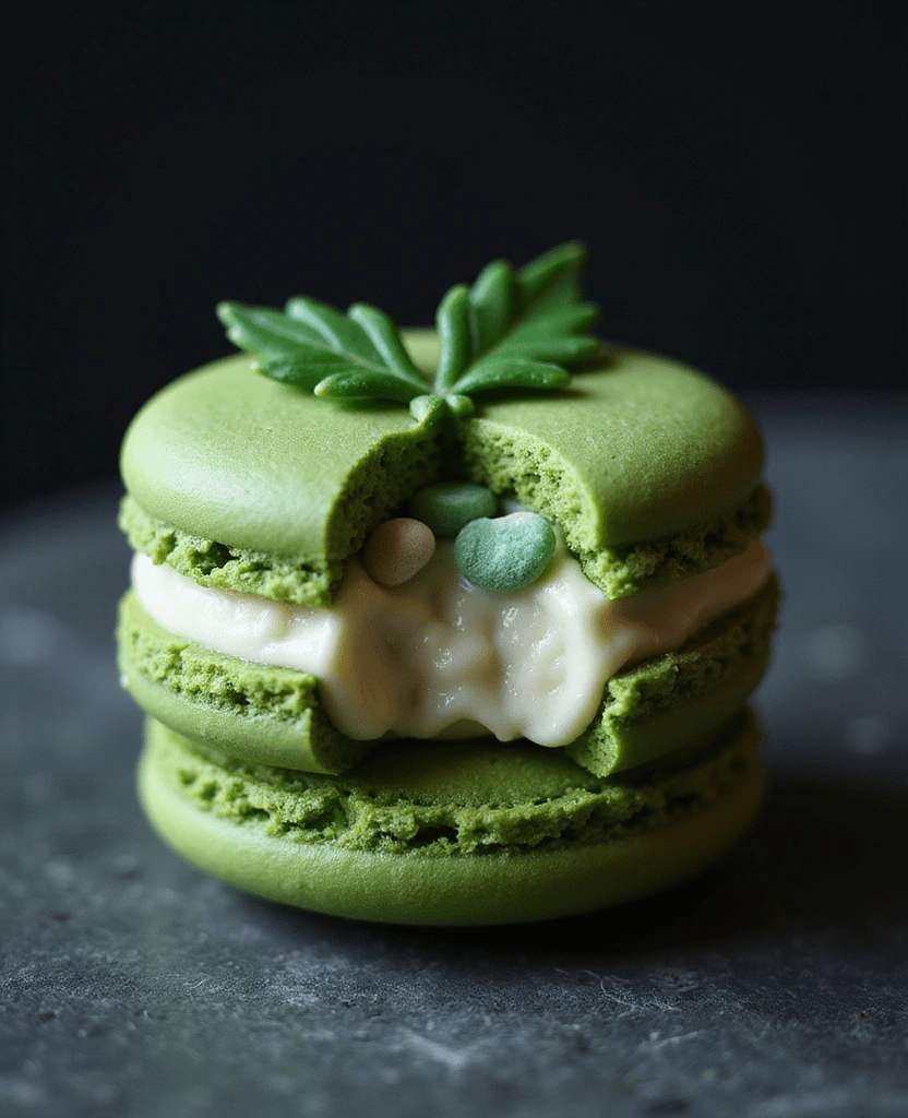 Buttery matcha macaron shells hand-painted with mistletoe leaves, filled with white chocolate ganache loaded with mistletoe-flavored Pop Rocks. One bite = crackle, pop, and a festive “kiss” in your mouth!