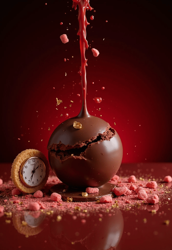 A glossy chocolate sphere hides an edible wafer clock + crackling Pop Rocks. At the table, pour scalding-hot raspberry coulis — the sphere melts in seconds, the clock “counts down,” and midnight strikes with a sparkling pop!