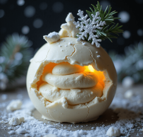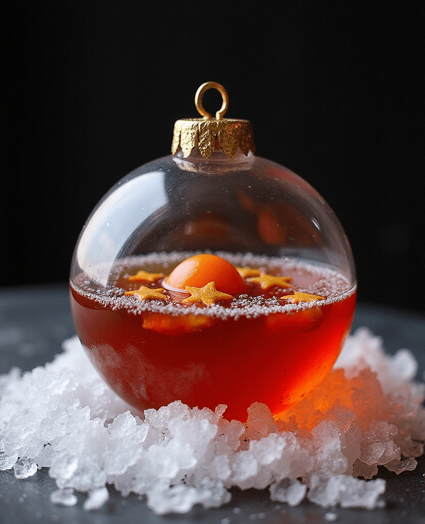 A delicate, shimmering consommé served inside a food-safe glass ornament. Guests shake it to create a silver snowstorm of edible glitter, then sip through the stopper. The floating carrot stars and subtle lychee “pop” add surprise and texture.