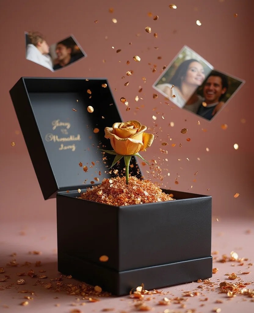 - When opened → box bursts into a 3D heart and a custom star map of the night you met falls out